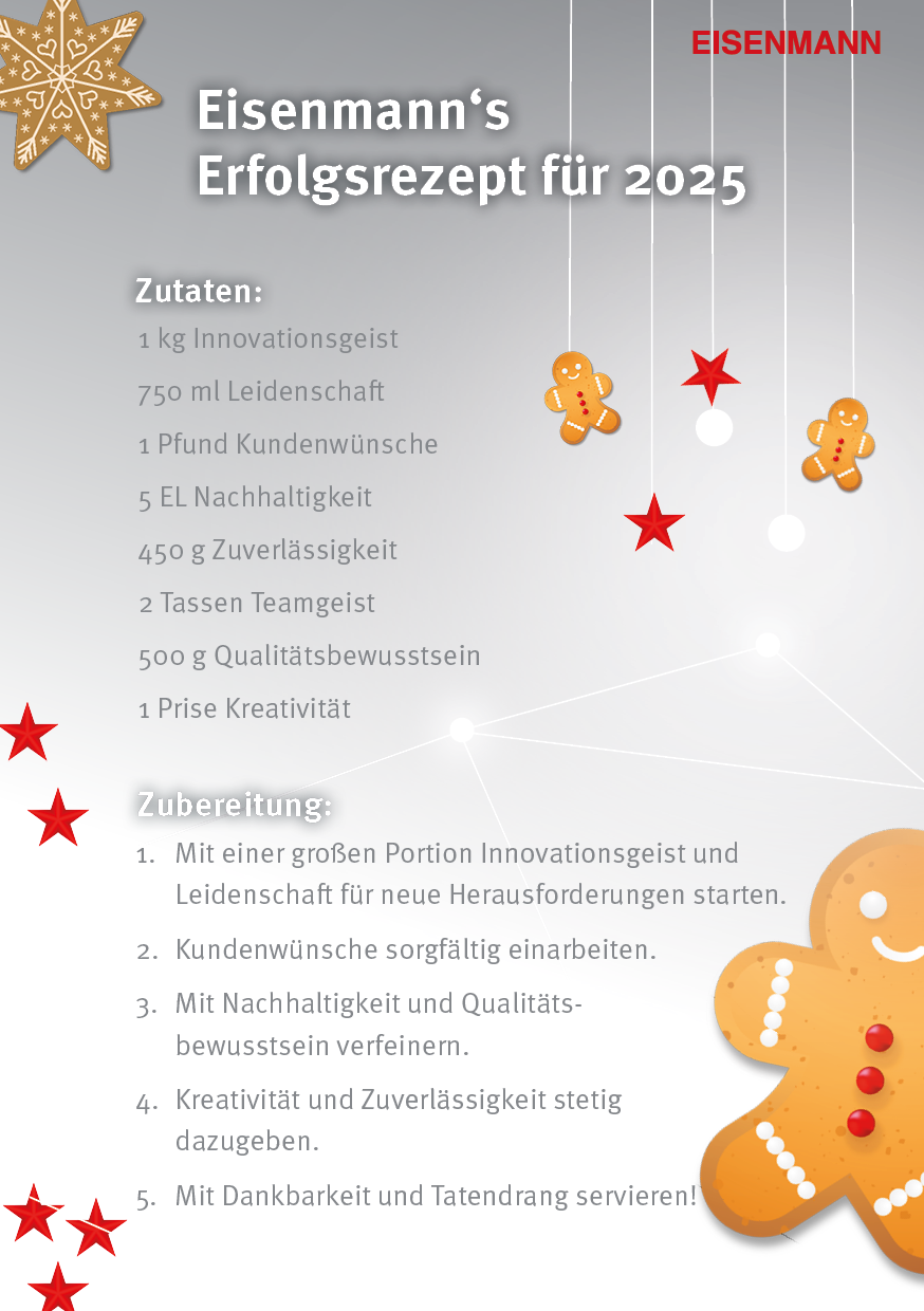 Das gesamte Eisenmann-Team wünscht Ihnen besinnliche Weihnachtstage und einen guten Start in ein glückliches, gesundes neues Jahr 2025.