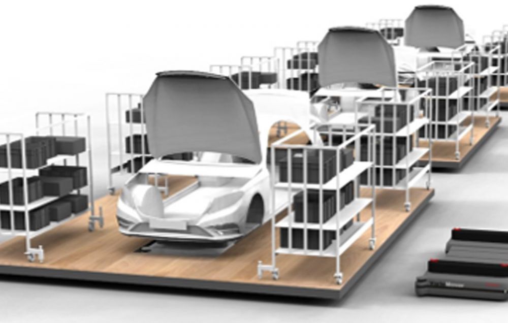 In addition to the functions of the PaintMover, the StoreMover is equipped with an integrated lifting device. It drives under the car bodies, lifts them, and transports them to a specified destination, either with or without a skid.